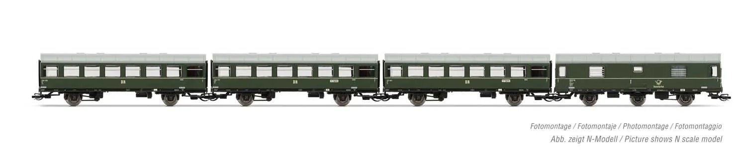 4-tlg.Set Reko Personenwagen, 3x 2.kl. mit Postwagen, DR