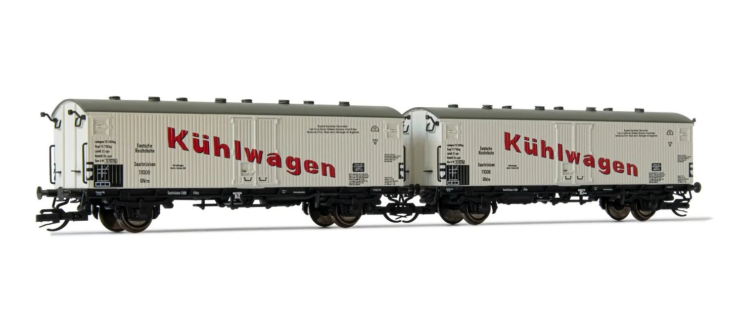 DRG, 2-tlg. Set 2-achs. Fährboot-Kühlwagen Gfhks, in "Kühlwagen"-Lackierung, Ep. II Für den Verkehr nach Großbritannien wurden Anfang der dreißiger Jahre Güterwagen beschafft, die dem kleineren britischen Lichtraumprofil entsprachen. Sie hatten auch die in Großbritannien übliche Saugluftbremse.Ab 1935 beschaffte die DRG neben gedeckten Wagen und Rungenwagen 50 Kühlwagen in zwei Losen. Die Waggons der Bauart Gfkhs Saarbrücken hatten Eisbehälter, die durch die oben liegenden Türen befüllt werden konnten. Die Wagen erhielten später die Typenbezeichnung Tbnhs Berlin. Viele von ihnen gab es noch nach dem Zweiten Weltkrieg. Rund 20 Wagen kamen zur DB, einige davon zur DR. Die Deutsche Bundesbahn vermietete rund die Hälfte der Tbnhs an die Firma Transthermos, die restlichen Wagen wurden von der DB als Tbnhs 30 eingesetzt.Nach 1964 war die neue Bezeichnung Icfrs 400 für 19 Wagen geplant. Allerdings war die bevorstehende Stilllegung bereits absehbar, und so ist nicht ganz sicher, wie viele Autos 1969 als Icfrs 400 ausgemustert wurden.