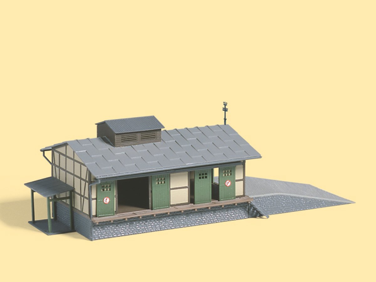 Die Einzelteile sind so gestaltet, dass aus zwei Bausätzen ein großer Güterboden oder eine Lagerhalle gebaut werden kann.