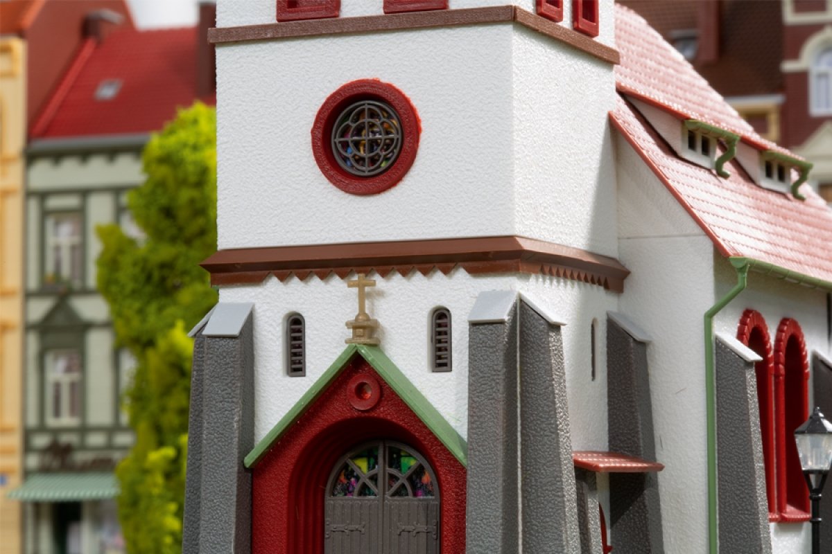 Kleinstadtkirche mit attraktiver Portal- und Fenstergestaltung.