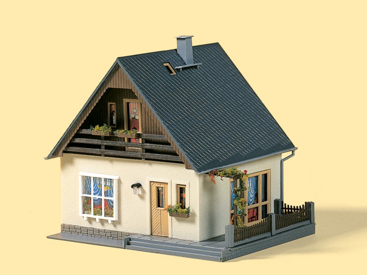 Einfamilienhaus mit großer Tür zur Terrasse, Blumenfenster, holzverkleideten Giebeln und Dachgaube, Loggia, Pergola, Terrassenzaun und Wasserfass sowie Blumendekomaterial.