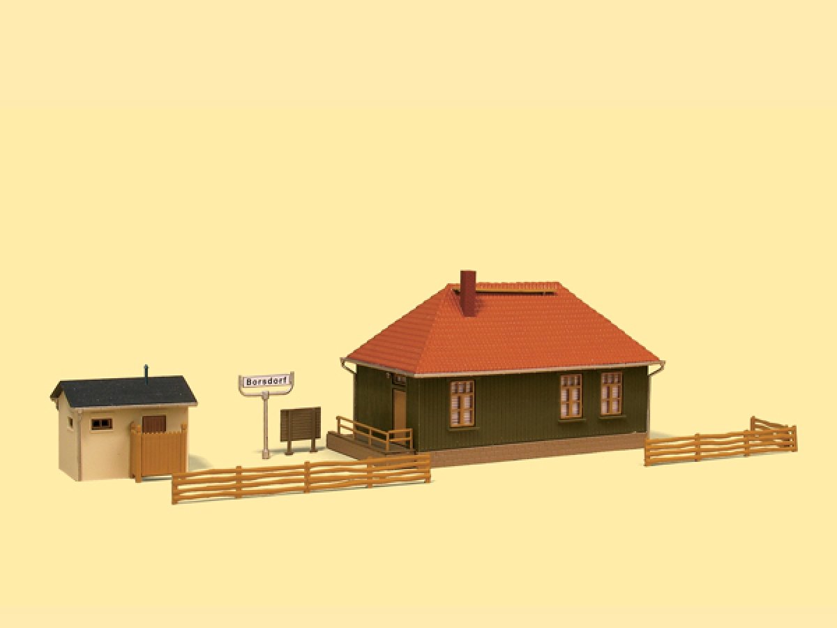 Kleiner Haltepunkt in Holzbauweise mit Zaun, Fahrplantafel, Läutewerk und Namensschild.