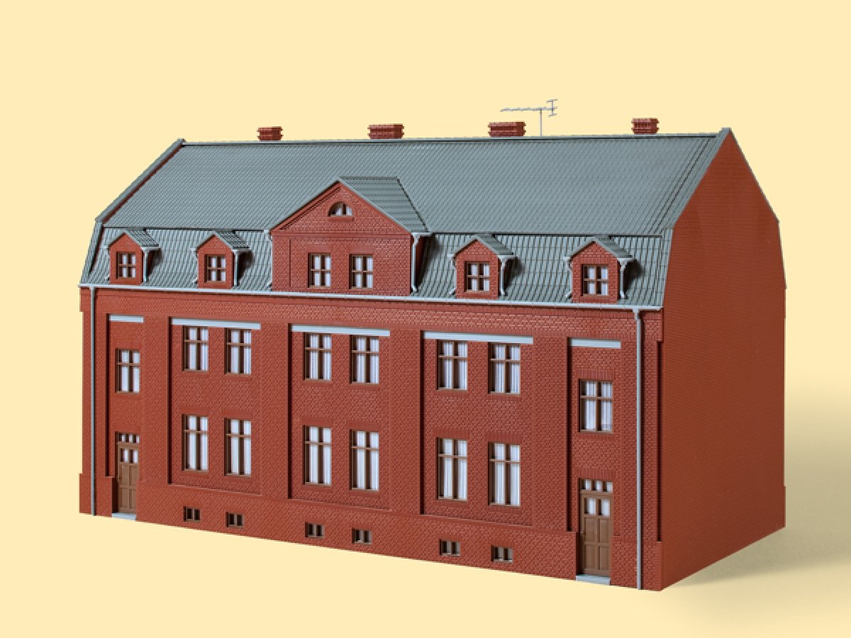 Einerseits kann man das 4-geschossige Grundmodell durch Sollbruchlinien zu einem 3- oder 2- geschossigen Gebäude umbauen und andererseits das Dach wahlweise mit oder ohne Dachgauben gestalten.