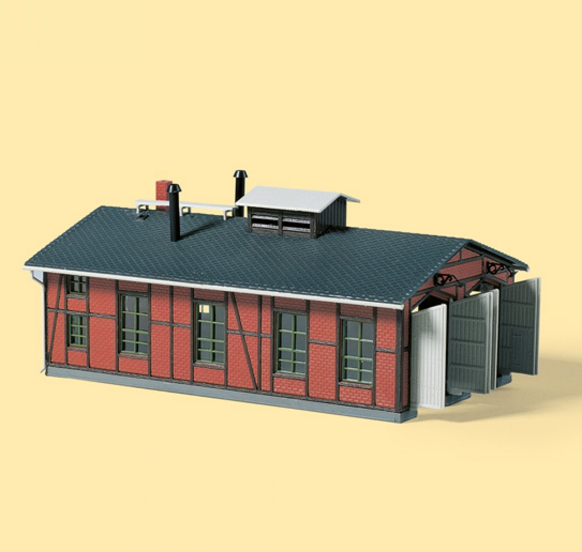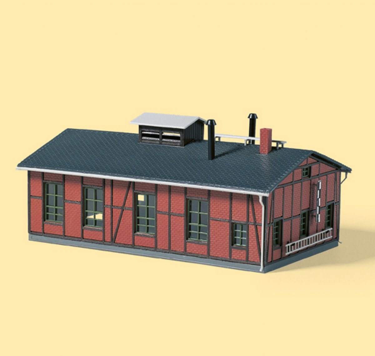 Rote Klinker mit Fachwerk machen den zweiständigen Lokschuppen sehr interessant.