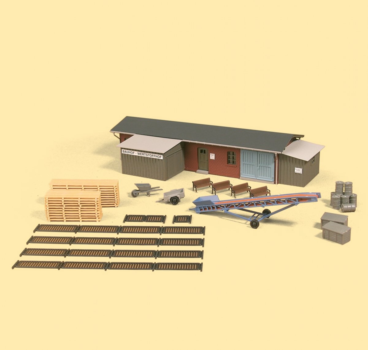 Ein zwecktypischer Ziegelbau mit zwei angebauten Schuppen und umfangreicher Ausstattung, wie Förderband, PKW-Anhänger, Bänke, Holzstapel, Fässer, Schubkarre, Werkzeugkisten sowie Zaun zur Einfriedung.