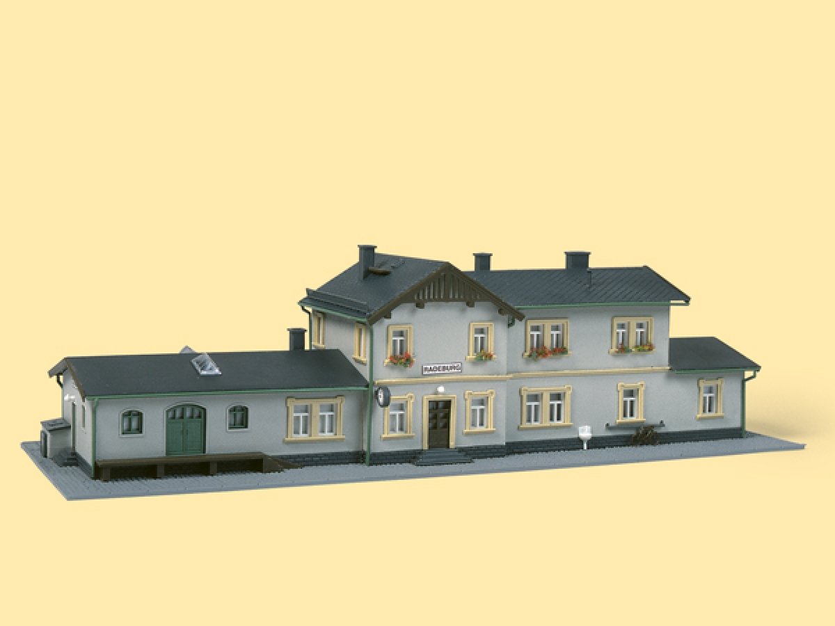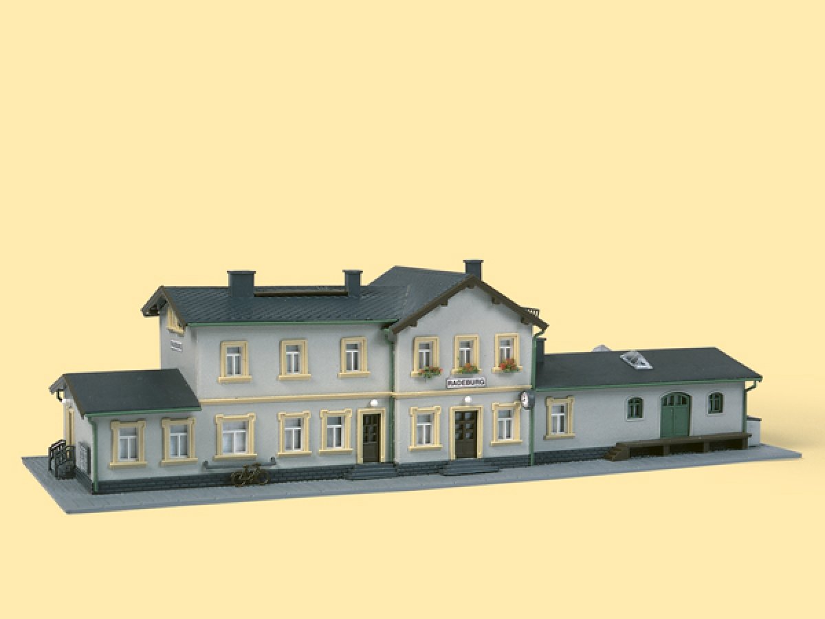 Mit Bahnsteig, Dienstgebäude, angebautem Güterschuppen und Rampe.