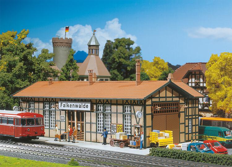 Typischer Kleinstadtbahnhof in Fachwerk-/ Klinkerbauweise, doppeltürigem Eingangsbereich und seitlich angebauter Laderampe.