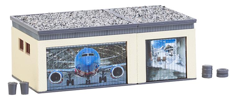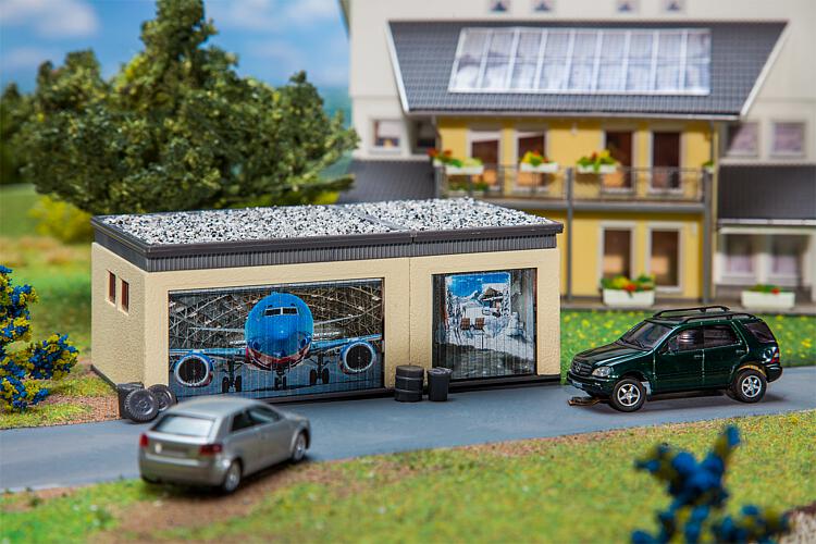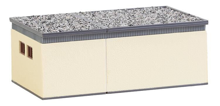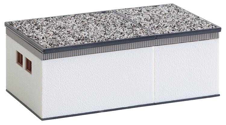 Doppelgarage mit geschottertem Dach und bedruckten Schwenktoren, von denen wahlweise eines über einen separat zu erwerbenden Servo (Servo 180726, Steuerung 180725) angetrieben werden kann.