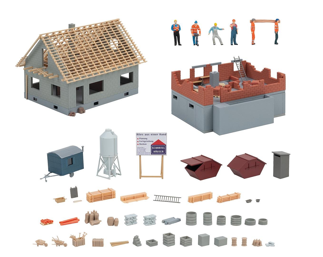 Einfamilienhaus im Bau, Haus im Bau, Silo, Bauwagen, 6 Figuren, Toilettenhäuschen, Container, Baustellenschild, sonstiges Zubehör (Schubkarren, Rohre, Steine, Säcke, Leitern, Werkzeuge etc.)