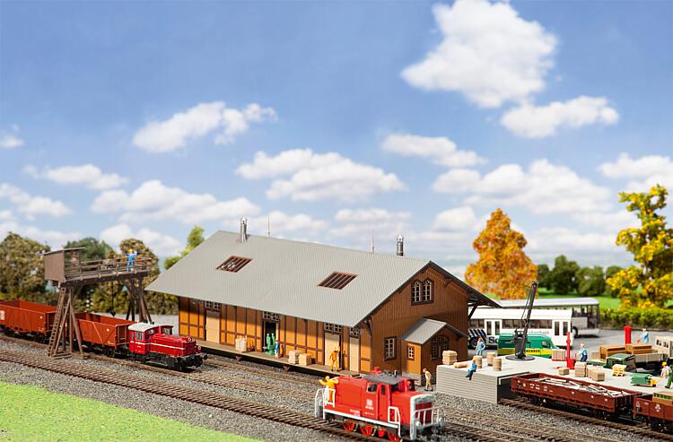 Dieses Set enthält einen großflächigen Güterschuppen in Holzbauweise mit zu öffnenden Schiebetoren und angebauten Verladerampen, einen Bockkran für den Güterumschlag von der Schiene auf die Straße und umgekehrt und eine gemauerte Verladerampe mit Schrägauffahrt und Verladedrehkran.