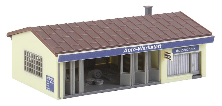 Werkstattgebäude mit weit zu öffnenden Schiebefalttüren und Teilen für die Inneneinrichtung.
