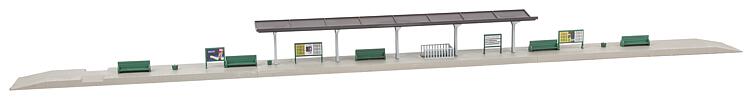 Eindrucksvoll! 2-teiliges Bahnhofs-Set bestehend aus einem repräsentativen Empfangsgebäude mit massivem Erdgeschoss und einem Inselbahnsteig mit Treppenabgang, Wartebänken und Werbetafeln als Zubehör.