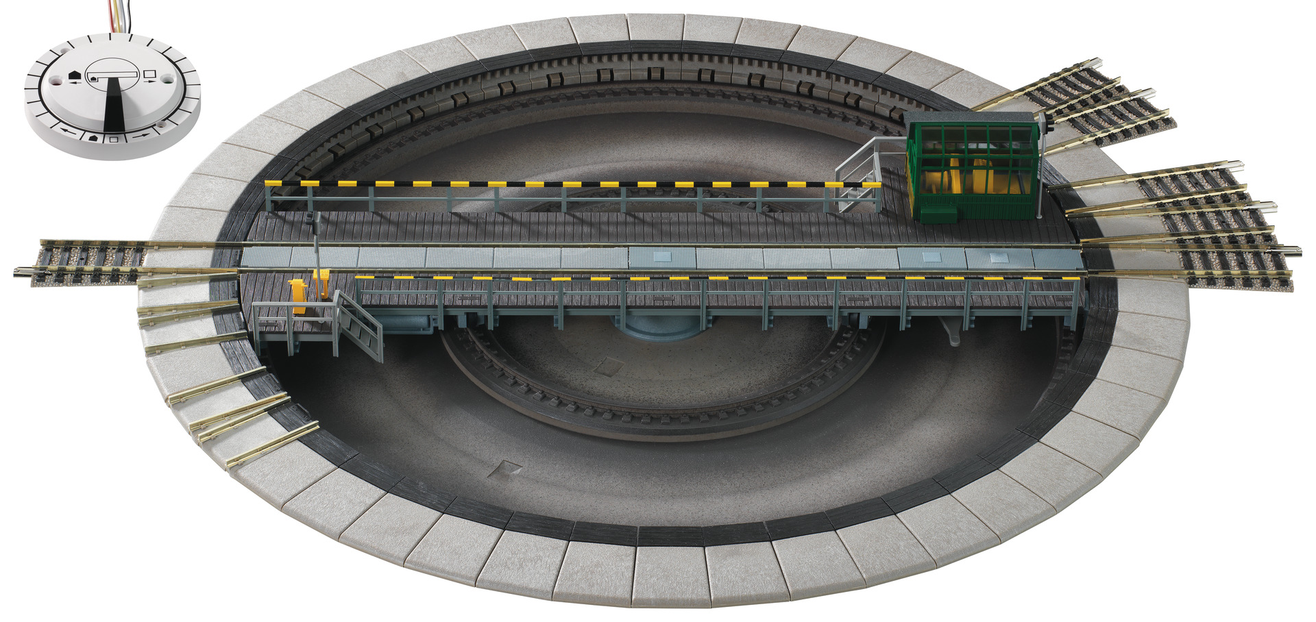 Komfort-Drehscheibe mit elektrischem Antrieb und elektrisch einzeln zuschaltbaren Gleisabgängen, mit Drehscheiben-Schalter 6910.