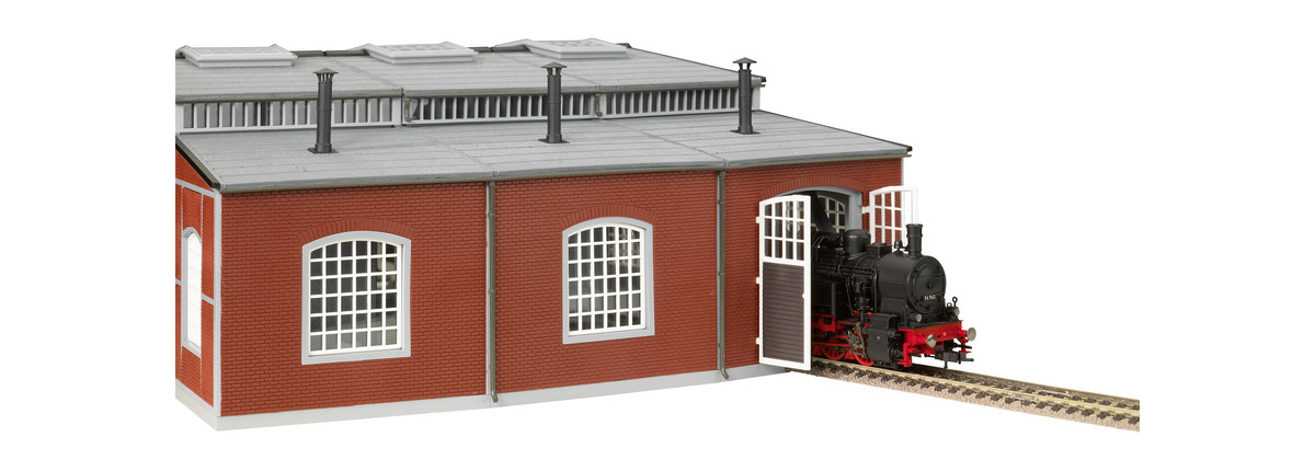 Auf der Rückseite des Lokschuppens befindet sich vorbildentsprechend ein Tor, das zum Durchfahren geöffnet werden kann. Ringlokschuppen können mehrfach nebeneinandergesetzt werden.