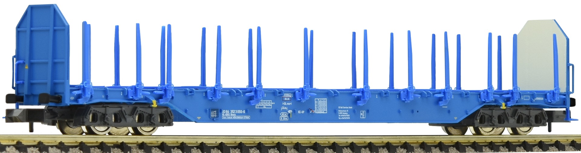 Der 4-achsige Güterwagen ist mit Rungen bestückt und mit Containerzapfen ausgerüstet.