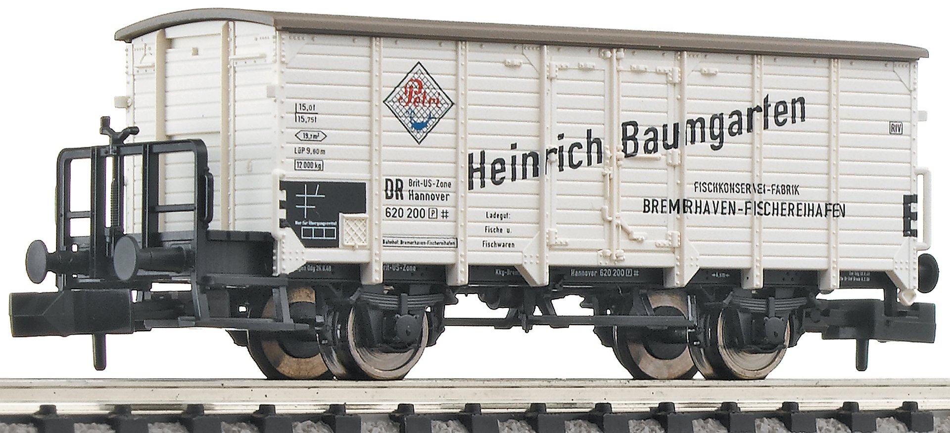 Kühlwagen "Heinrich Baumgarten", mit Bremserbühne und Anschriften der brit.-US-Zone, der DB, Epoche III