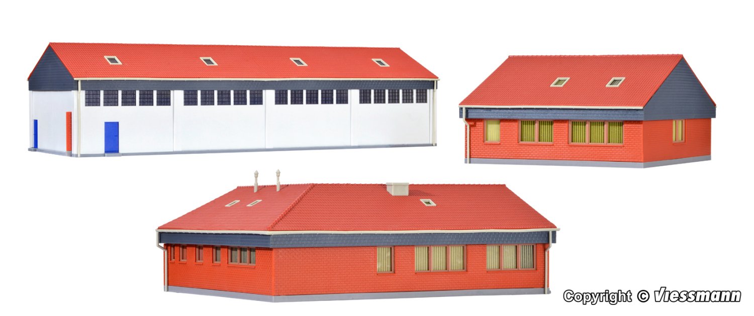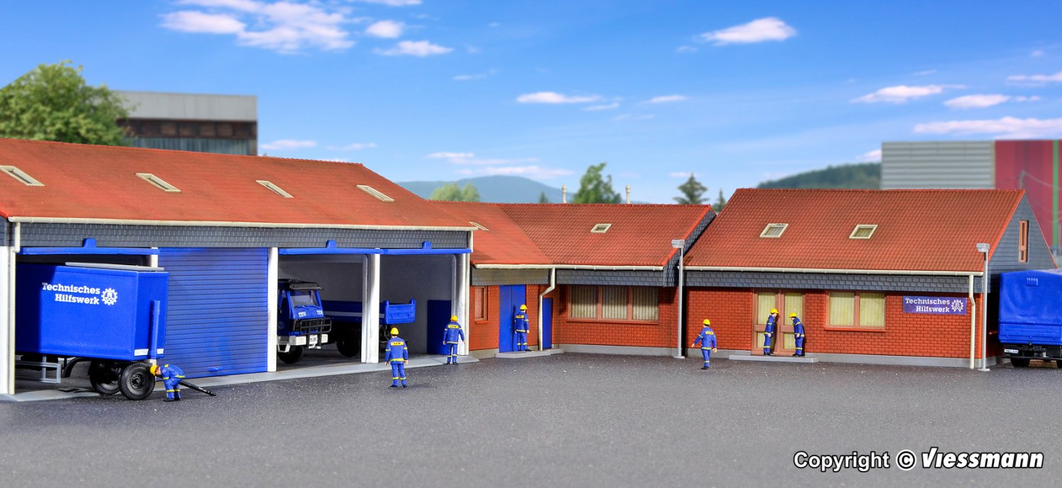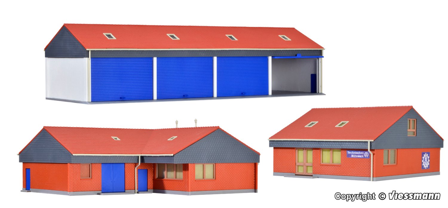 Dieses Set besteht aus der Fahrzeughalle und 2 Verwaltungsgebäuden. Die Fahrzeughalle ist ein moderner Garagenbau und bietet Platz für mindestens 4 LKW. Die 4 breiten Rolltor-Nachbildungen erlauben auch das Einfahren von Lastwagen mit Plane. Im kibri Sortiment gibt es eine umfangreiche Auswahl an passenden THW Fahrzeugen.