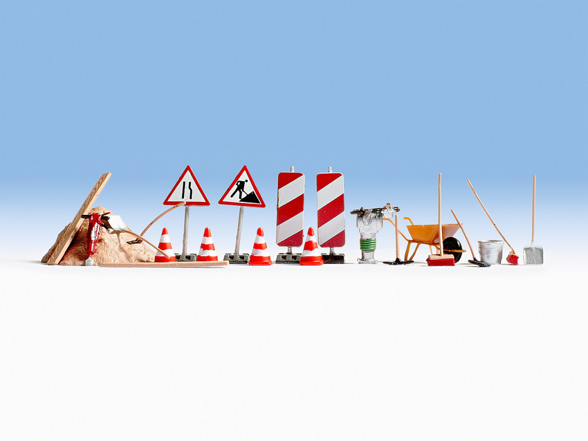 Sandhügel, Presslufthammer, Warnschilder, Pylone, Baken, Stampfer, Hacke, Schubkarre, verschiedene Besen und Schaufeln, Eimer
