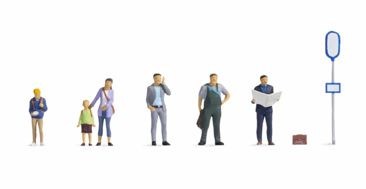 Im Figuren-Set in der Spurweite H0 sind sechs Figuren, ein Gepäckstück sowie ein Haltestellenschild enthalten. Der Mann im Mantel hat seinen Aktenkoffer neben sich abgestellt und vertreibt sich die Wartezeit mit Zeitung lesen. Diese hält er aufgeschlagen in den Händen. Ein Mann in Latzhose und T-Shirt hält seine Jacke in der Hand und stützt die andere in der Hüfte ab. Ein weiterer Mann trägt ein Jackett und hält sein Handy zum Telefonieren an sein Ohr. Außerdem befindet sich eine Mutter im Set, die eine Tasche umgehängt hat und eine Hand nach ihrem Sohn ausstreckt. Dieser steht mit einem Schulranzen auf dem Rücken neben ihr und hat kurze Hosen sowie ein langärmliges Shirt an. Ein junger Mann wartet ebenfalls auf den Bus und schaut dabei auf sein Handy.