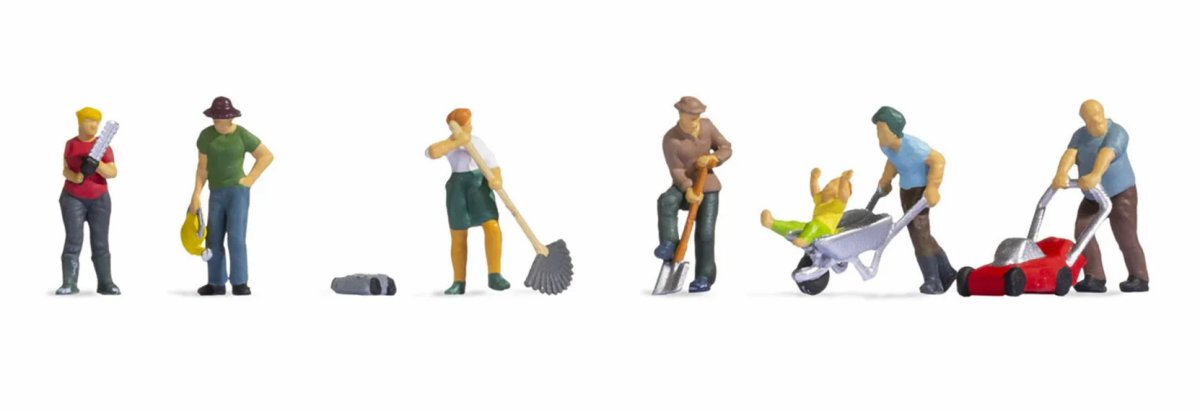 In dem Figuren-Set für die Spurweite H0 sind sieben Figuren sowie verschiedene Arbeitsutensilien und Werkzeuge zur Gartenarbeit enthalten. Ein Mann mit Halbglatze und Bart trägt ein T-Shirt sowie eine lange Hose und schiebt den Rasenmäher vor sich her. Eine Frau mit Haartuch, Latzhose und Gummistiefel hält eine elektrische Heckenschere in den Händen und macht sich an die Arbeit. Der Mann mit Hut und Schaufel gräbt ein Loch in den Boden, während eine weitere Frau mit Zöpfen und Schürze Laub mit einem Besen zusammenfegt. Zudem ist ein jüngerer Mann enthalten, der einen Schubkarren schiebt, in dem ein Junge sitzt, welcher beide Hände vor Freude in die Höhe streckt und glücklich lacht. Ein anderer Mann mit Hut hält eine Gießkanne in der rechten Hand, um die frisch eingepflanzten Samen, welche die Frau neben ihm einpflanzt, zu gießen.