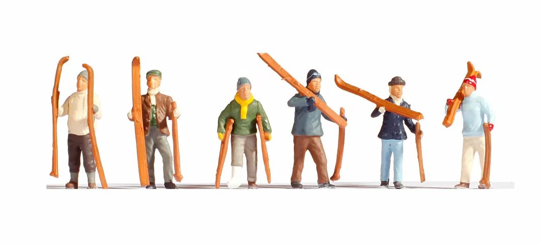 Drei davon tragen ihre braunen Skier auf der Schulter, ein Mann in brauner Jacke und grünem Pullover in den Händen und eine weitere Person ist gerade dabei Ihre Ski zusammenzustecken. Das Set beinhaltet zudem einen Verletzten, der mit Gips am rechten Fuß an Krücken geht.