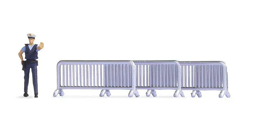 In dieser Szene sind ein Polizist und drei silberne Absperrgitter enthalten. Der Polizist trägt seine blaue Uniform mit Schirmmütze. Die Hand hat er warnend nach vorne ausgestreckt, um ein heranfahrendes Auto anzuhalten.