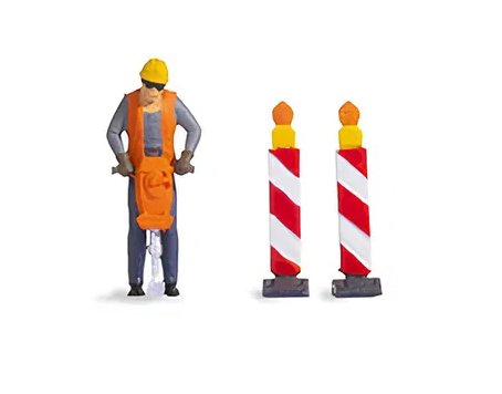 In dieser Szene ist eine männlicher Arbeiter mit einer orangen Weste und einem gelben Bauarbeiterhelm enthalten. Er hält einen Presslufthammer mit beiden Händen fest. Ebenfalls enthalten ist dazu passende Straßenabsperrung in dem typischen weiß-rot.