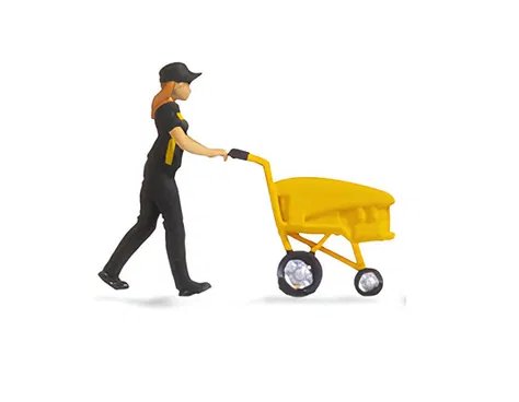 In dieser Szene ist eine weibliche Postbotin mit einem typischen schwarz-gelben Oberteil und einer Schlägermütze enthalten. Sie schiebt einen typischen gelben Postwagen vor sich her in dem sich Briefe zum verteilen befinden.