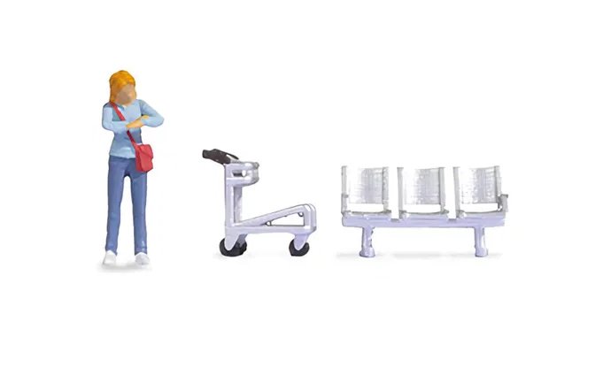 In dieser Szene schaut eine weibliche Reisende gerade auf Ihre Armbanduhr. Sie trägt ein hellblaues Oberteil und eine dunkelblaue Hose. Zusätzlich hat Sie sich eine rote Tasche umgehängt. Passend dazu erhalten Sie eine Sitzbank für Bahnhöfe und einen Gepäckwagen.
