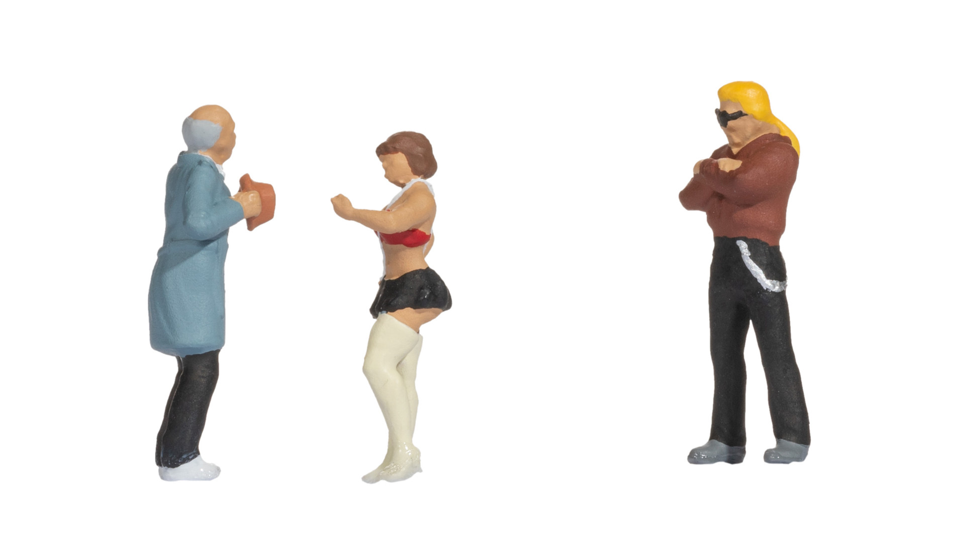 Mit Funny-Scenes “Straßenstrich” bringt NOCH eine gewagte und humorvolle Szene für Ihre Modellbahnanlage! Dieses Set zeigt das Geschehen auf einer Straße bei Nacht: Ein älterer Herr schaut verlegen, während eine selbstbewusste Dame im kurzen Outfit und auffälliger Pose das Gespräch sucht. Neben den beiden steht ein weiterer Mann mit verschränkten Armen und prüfendem Blick, als würde er die Lage genau beobachten.