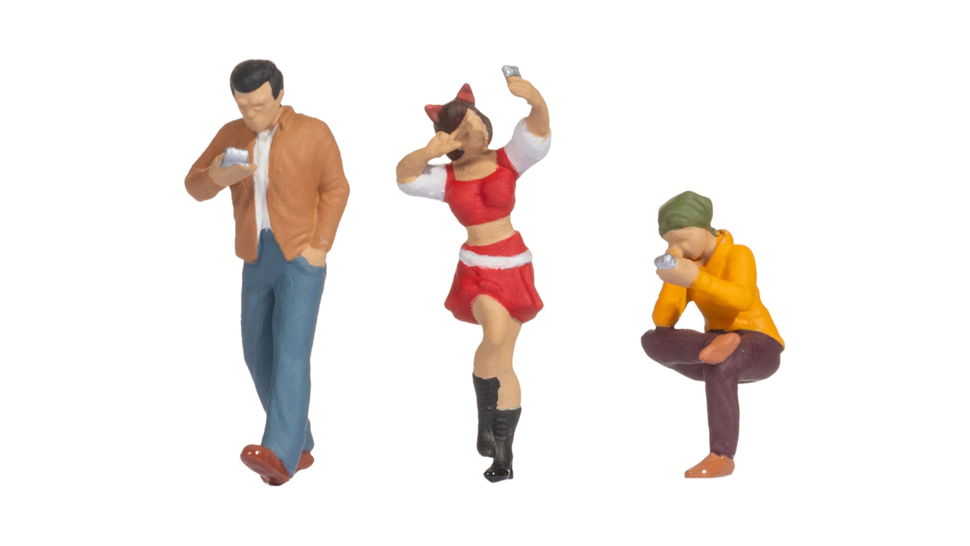 Mit Funny-Scenes “Smombies” bringt NOCH eine zeitgemäße und humorvolle Szene für Ihre Modelllandschaft! Dieses Set zeigt drei typische Smartphone-Zombies, die ganz in ihre digitalen Welten vertieft sind. Der Mann auf der linken Seite geht gedankenversunken mit gesenktem Blick, fixiert auf sein Handy. In der Mitte posiert eine junge Frau mit Katzenohren spielerisch für ein Selfie, während sie eine typische Pose macht. Die dritte Figur sitzt auf einer Bank oder Mauer, konzentriert mit dem Handy beschäftigt und von der Umgebung völlig unbeeindruckt.