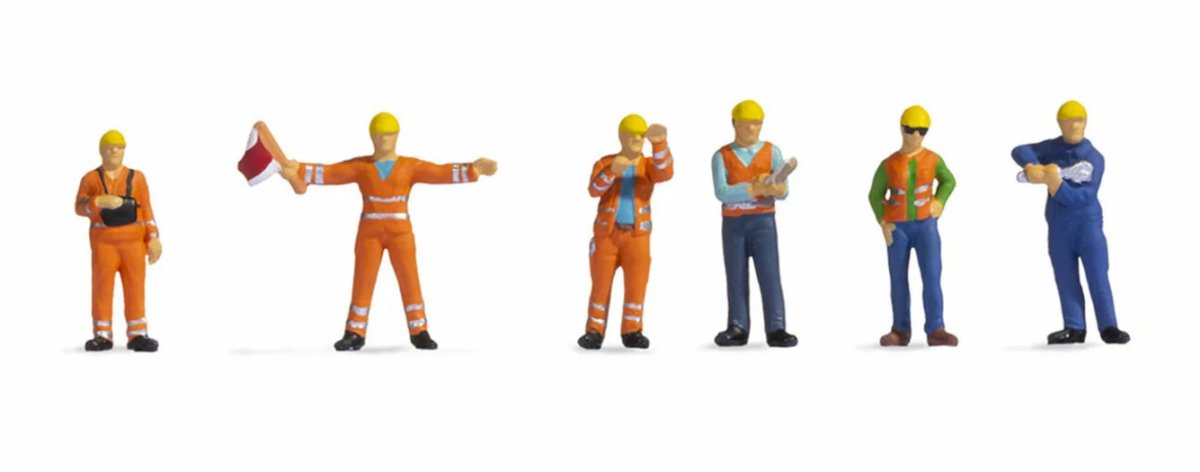 In dem Set sind sechs Figuren enthalten. Sie haben alle ihre Arbeitskleidung an und tragen einen Schutzhelm auf dem Kopf. Ein Mann streckt seine Arme zur Seite aus, um die Passagiere zu warnen. Dabei hält er eine Fahne in der rechten Hand. Ein anderer Mann mit Klemmbrett in der Hand macht sich Notizen und hält so die einzelnen Arbeitsschritte fest. Zwei weitere Männer sind mit Werkzeugen ausgestattet und machen sich an die Arbeit. Die Frau mit Schutzbrille wirft einen prüfenden Blick auf die getane Arbeit, während ein Rangierer den anderen ein Handzeichen zur weiteren Arbeitsanweisung gibt.