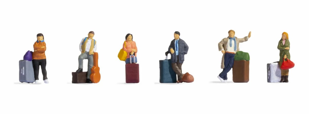 Das Figuren-Set "Reisende" für die Spur TT ist optimal geeignet, um Bahnhofsszenen mit Leben zu füllen. Eine Frau mit Pony-Frisur steht neben ihrem großen Koffer, auf dem sie ihre Handtasche abgestellt hat. Ein Mann mit Gitarre hat einen Fuß auf seinem Koffer abgestützt. Zudem befinden sich zwei weitere Frauen im Set, die neben ihrem Reisekoffer stehen und eine Handtasche dabei haben. Die anderen Männer lehnen sich an ihren Koffern an und haben ebenfalls ein Handgepäck dabei. Einer von ihnen trägt einen Schal und streckt seine Hand zur Seite aus, um ein heranfahrendes Taxi anzuhalten.