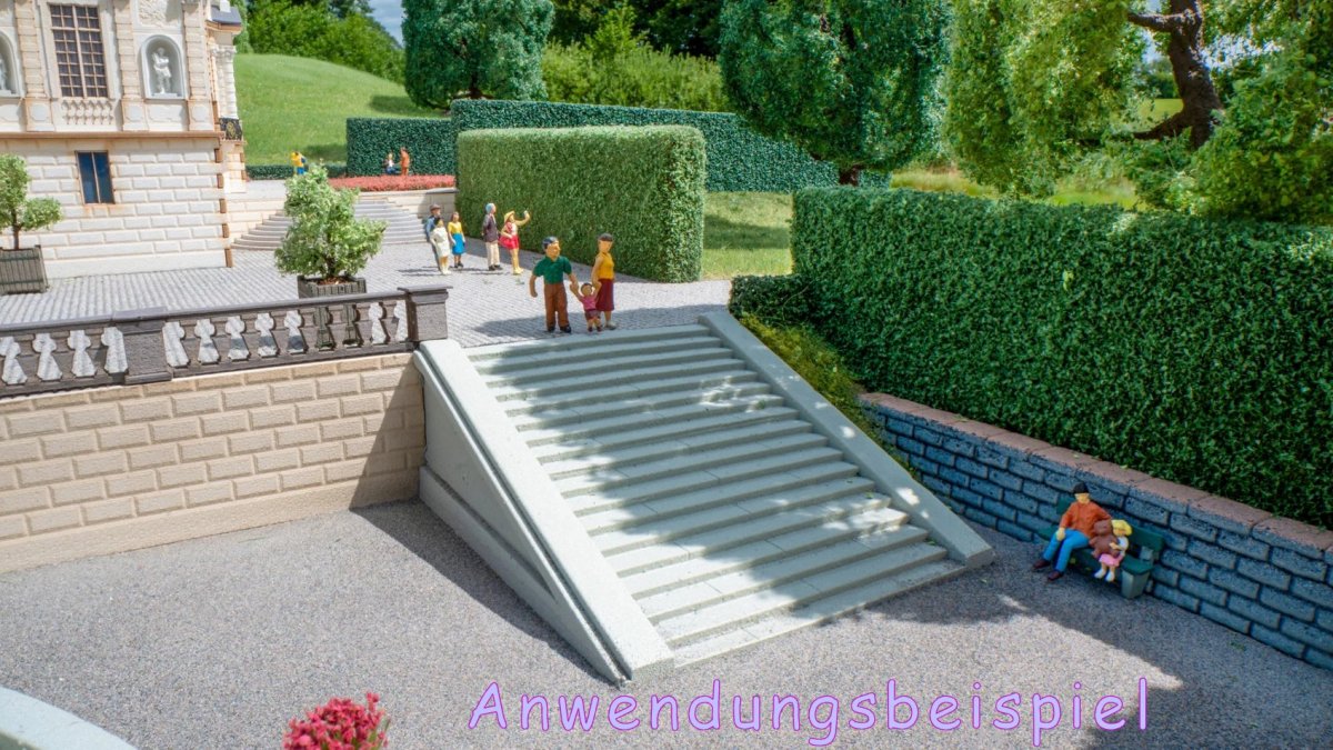 Die „Freitreppe, gerade“ ist ein elegantes Gestaltungselement für Ihre Modellbahnanlage oder Diorama. Mit ihrer klaren Linienführung und den gleichmäßigen Stufen eignet sie sich ideal für repräsentative Zugänge zu Gebäuden wie Schlössern, Herrenhäusern, Rathäusern oder Parkanlagen.