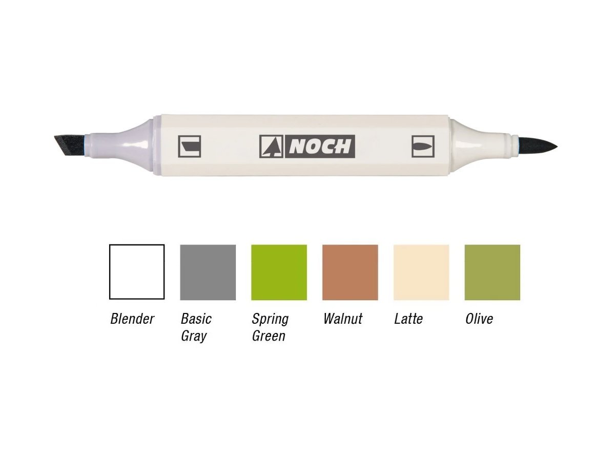 Die innovativen Marker in fünf Naturfarben und einem Blender sind ideal für die finale Farbgestaltung von Landschaftselementen wie Felsen (Gips, Hartschaum, Papier etc.), Mauern (Hartschaum, Papier, Pappe etc.), Modellgewässern usw. geeignet.