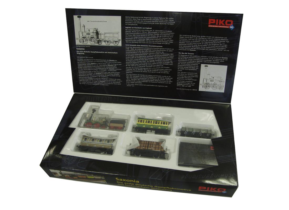 Als Wagen haben wir der Saxonia einen geschlossenen Güterwagen, zwei verschiedene Personenwagen mit kutschenförmigen Einzelabteilen und einen offenen Güterwagen beigefügt.