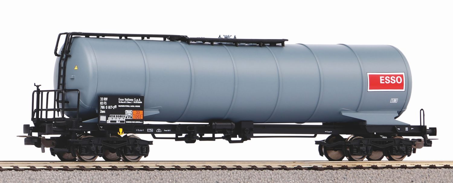 Druckvariante des Knickkesselwagens „Esso”, eingestellt bei der FS in der Ausführung der Epoche V. Anfang der neunziger Jahre wurden die ersten Tankwagen mit einem sogenannten “Knickkessel” gebaut. Die Konstruktion der Kessel erfolgte so, dass sich die beiden Kesselhälften zur Mitte hin um jeweils 3° neigen. Deshalb fließt der Kesselinhalt, in der Hauptsache Mineralölprodukte, ohne weitere Hilfsmittel so gut wie restlos ab. Da die in Stahlleichtbauweise gefertigten Fahrzeuge für höhere Geschwindigkeiten geeignet sind, wurden sie bald auch von anderenUnternehmen in ganz Europa beschafft. Zu finden sind diese Waggons als P (=Privat)-Wagen im Bestand aller europäischer Bahngesellschaften.