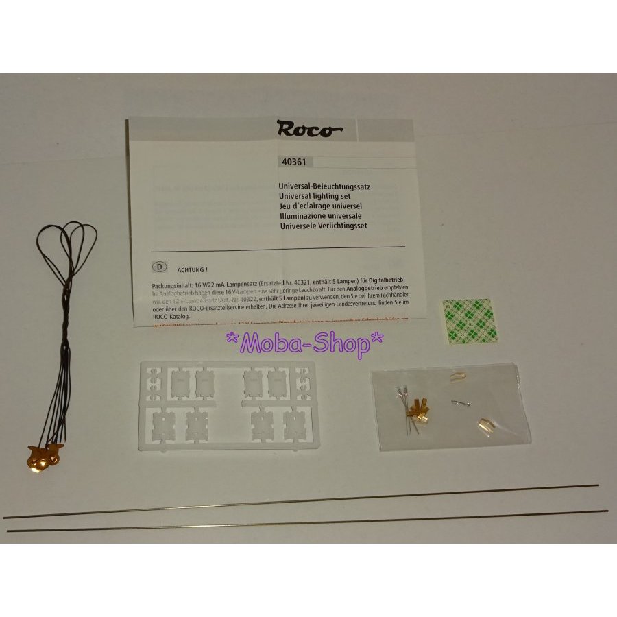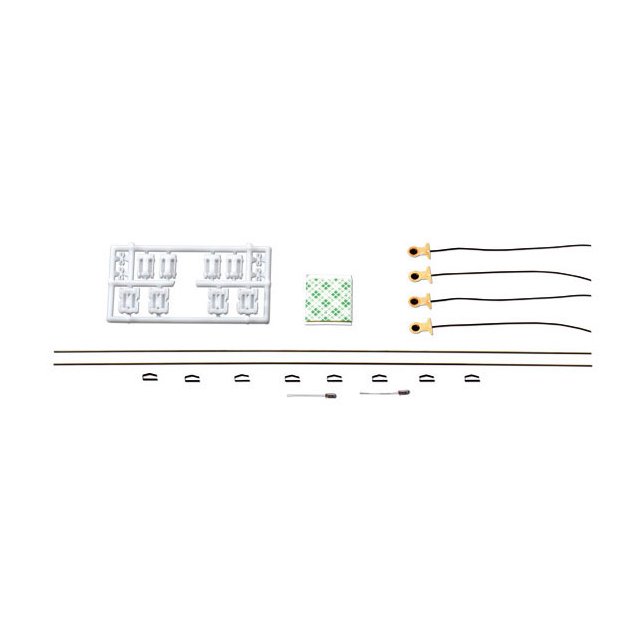 Bausatz: Enthält eine 150 mm lange, flexible Leiterbahn, zwei Lampenträger, zwei Drahtlampen 16 V/22 mA, vier Radstromabnahmekontakte; Befestigungsmaterial.