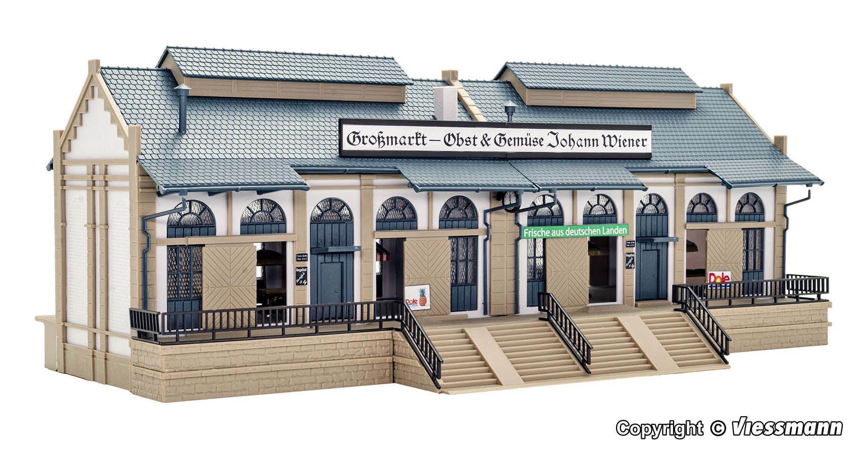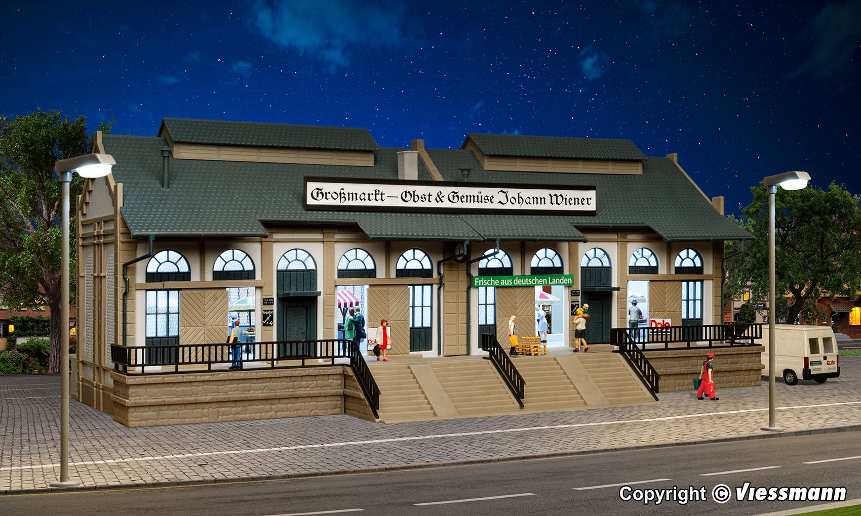 Das Gebäude verfügt über einen großen Treppenaufgang, Marktstände und eine Laderampe an der Rückseite.