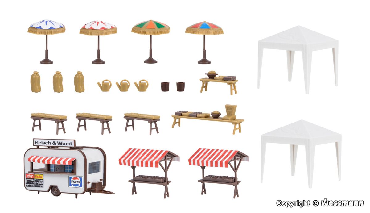 Mit verschiedenen Marktständen, Verkaufswagen und Zubehör.